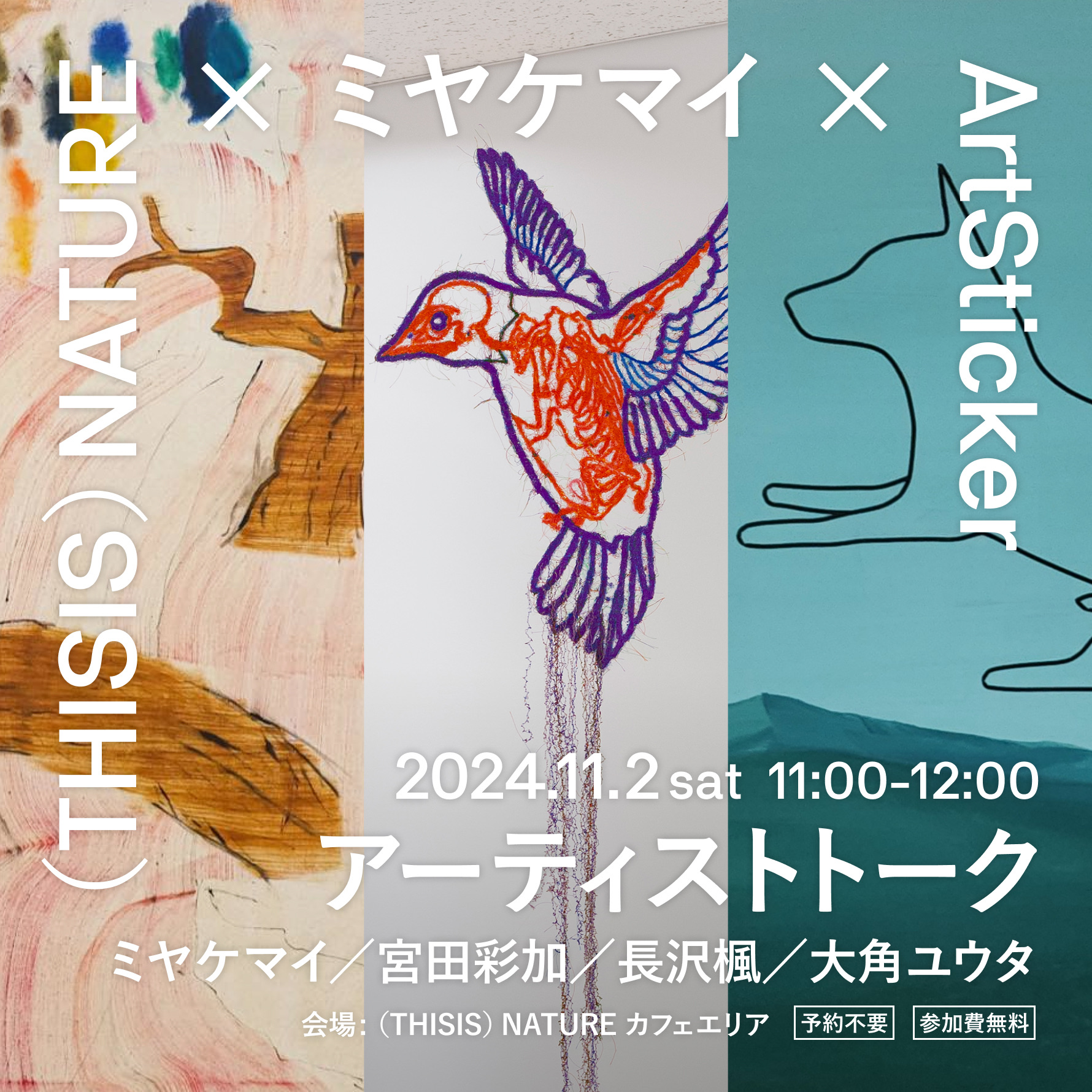 アートディレクターのミヤケマイをモデレーターに迎え、(THISIS)NATUREにて展示中のアーティスト3名が作品にまつわるお話や作家活動における楽しさや苦労などを語ります。